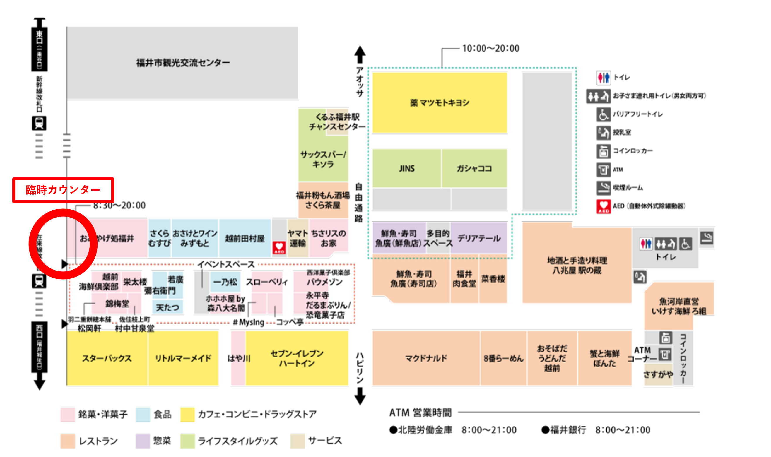 店舗一覧/●さくらむすび●おさけとワインみずもと●越前田村屋●ちさリスのお家●福井粉もん酒場 さくら茶屋●サックスバー/キソラ●越前海鮮倶楽部●栄太楼●羽二重餅總本舗 松岡軒●錦梅堂●佐佳枝上町 村中甘泉堂●彌右衛門●若廣●天たつ●一乃松●ホホホ屋by森八大名閣●スローベリィ●#MysIng●コッぺ亭●西洋菓子倶楽部 バウメゾン●永平寺だるまぷりん/恐竜菓子店●スターバックス●リトルマーメイド●はや川●薬 マツモトキヨシ●JINS●デリアテール●寿司・鮮魚 魚廣●福井肉食堂●菜香楼●地酒と手造り料理 八兆屋駅の蔵●8番らーめん●おそばだうどんだ越前●蟹と海鮮ぼんた●魚河岸直営 いけす海鮮ろ組●おみやげ処福井